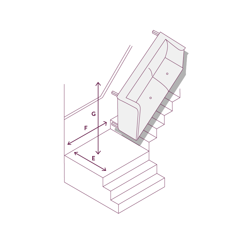 Whether you live above the ground floor in a block of flats or you’ve decided that you want to put your new sofa upstairs in your home, you’re going to have to check that it will fit up the stairway(s). Much like you have with your doorways, measure the width of any relevant staircases at their narrowest point. If there are any landings, you’ll also want to measure the depth (E), width (F), and height (G) to check that they won’t cause any problems.