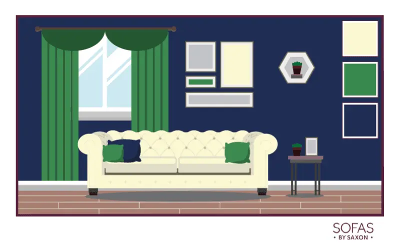 If you’re looking to make more of a colourful statement, muted shades can work very well. For example, an emerald green sofa will really complement a nude pink shade. Or, if you’re going for a more dramatic look, a backdrop of navy blue can really work with an olive-green settee.